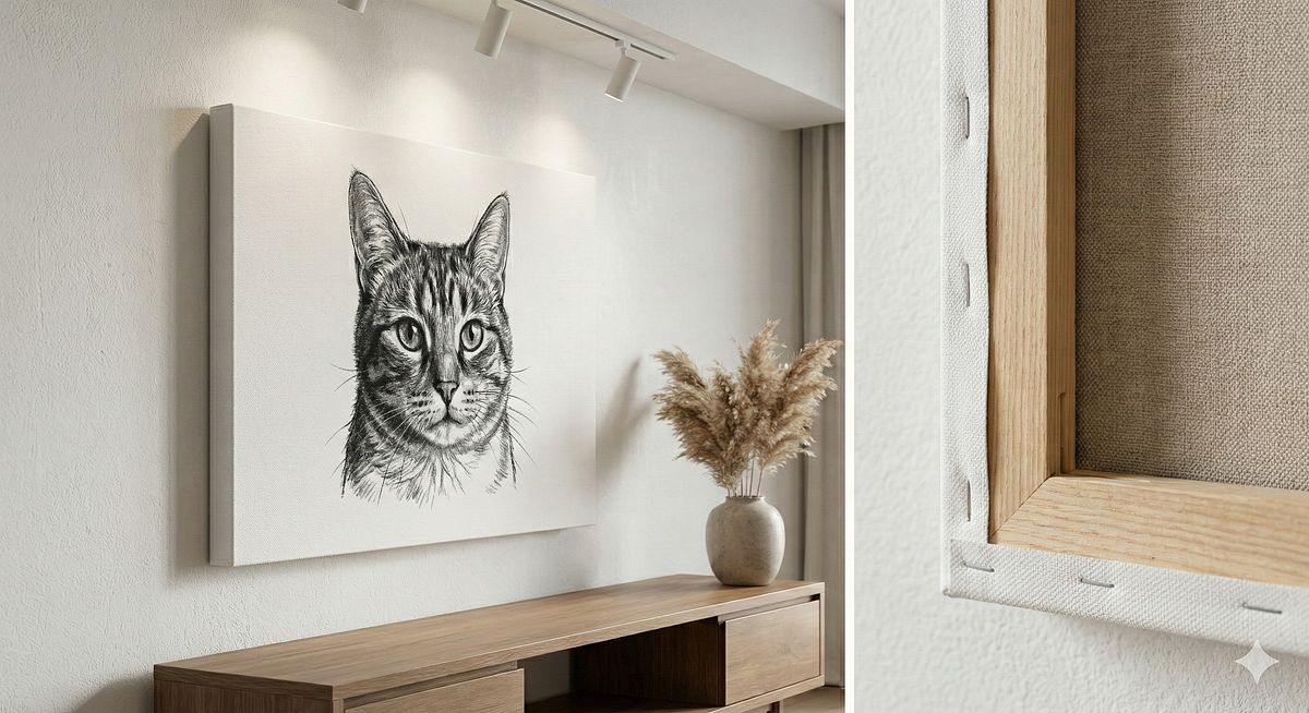 A nossa opção mais artística. O seu pet é imortalizado em tela de algodão premium, conferindo uma textura única e uma durabilidade excecional. Disponível em vários formatos para se ajustar perfeitamente ao espaço da sua casa.